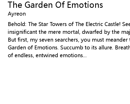 | Behold: The Star Towers of The Electric Castle! See how it embraces the sky! How insignificant the mere mortal, dwarfed by the majesty of its electric edifice! But first, my seven searchers, you must meander through the verdant vines of the Garden of Emotions. Succumb to its allure. Breathe deep the intoxicating aroma of endless, entwined emotions... |