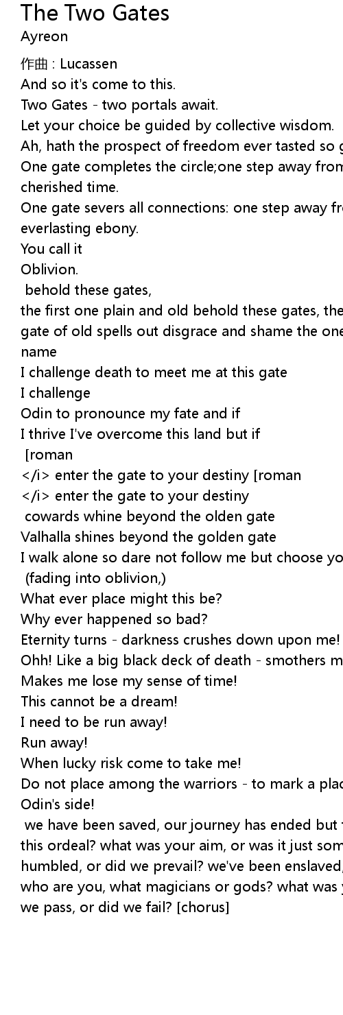 | I fail I'll die a worthy man [chorus] [roman]</i> open the gate, we're now on our own [all]</i> enter the gate to your destiny [roman]</i> will it be fortune or fate, the truth shall be known [all]</i> enter the gate to your destiny [barbarian] cowards whine beyond the olden gate | |