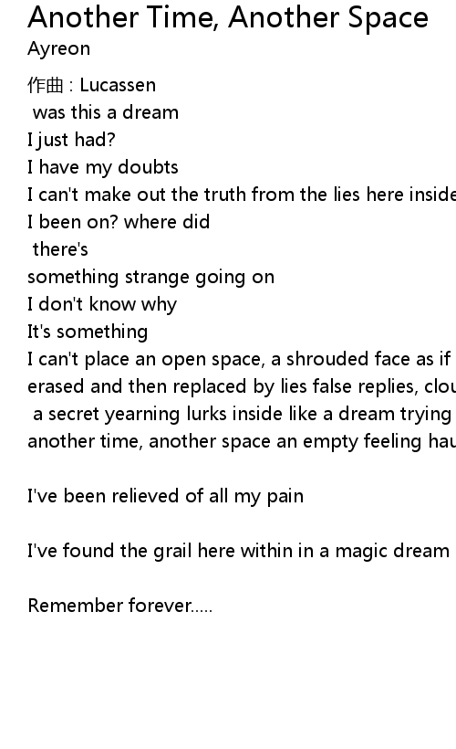 | I can' t place an open space, a shrouded face as if my memory files have been erased and then replaced by lies false replies, clouded skies hippie futureman chorus a secret yearning lurks inside like a dream trying to hide another time, another space an empty feeling haunts my brain a strange void | |