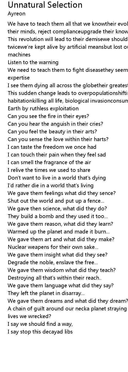 | This revolution will lead to their demisewe should not make the same mistake twicewe're kept alive by artificial meansbut lost our souls to a world of machines | |