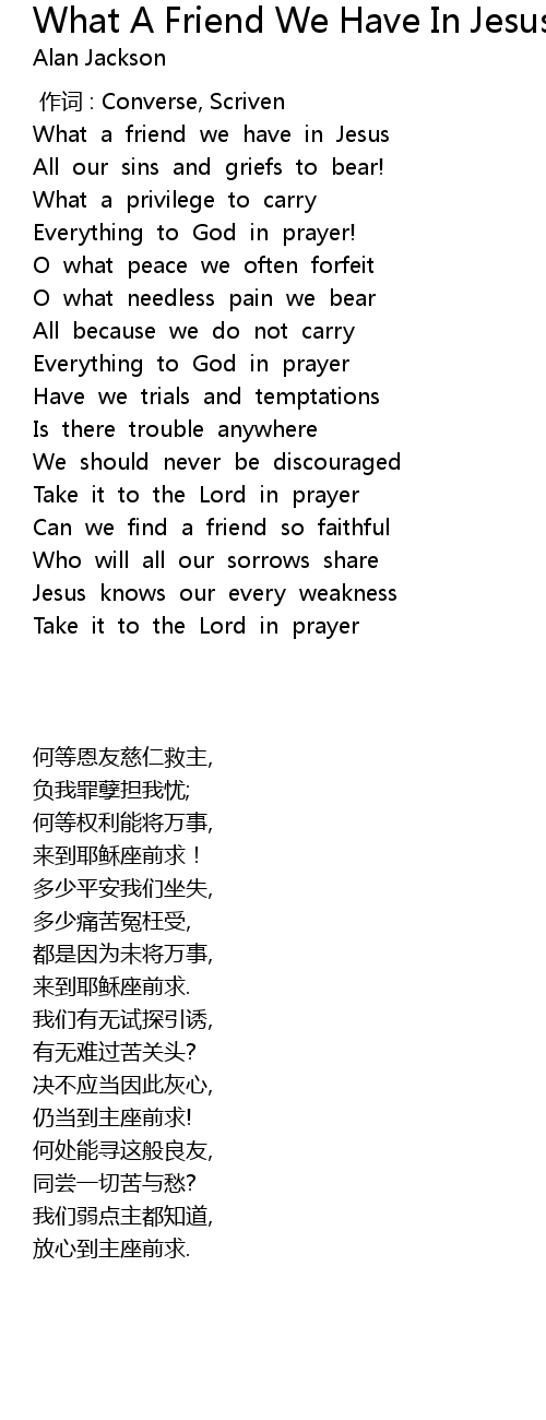 | [00:14.800] | What a friend we have in Jesus |