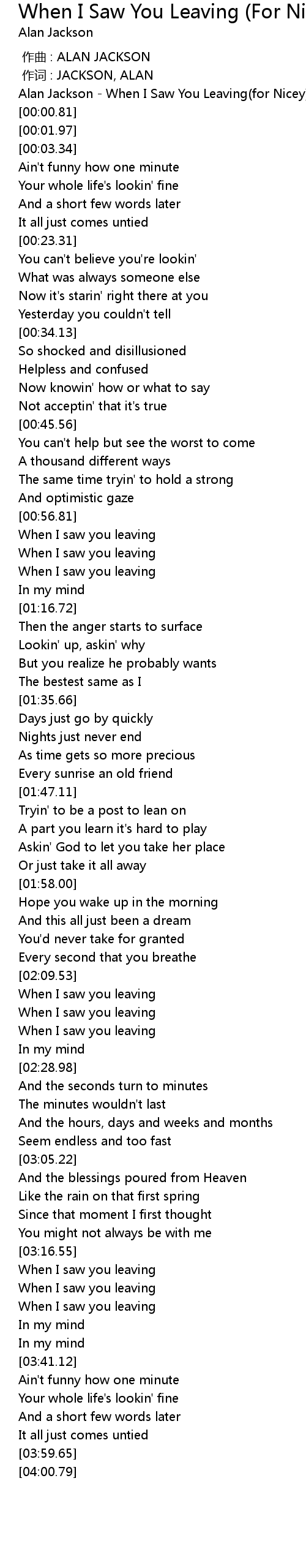 | [00:00.00] | Alan Jackson When I Saw You Leaving for Nicey |