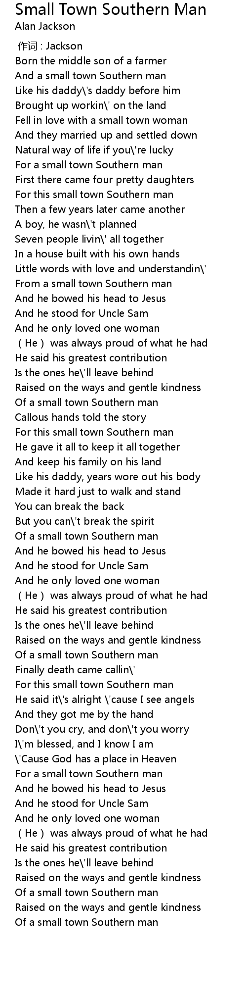 | [01:12.51] | From a small town Southern man |