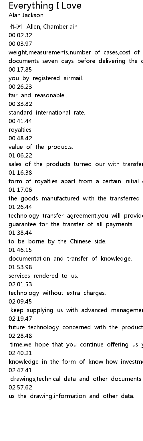 | [00:58.161]01:06.22] | 887.The royalty rate shall be calculated on the net sales of the products turned our with transferred technology. |