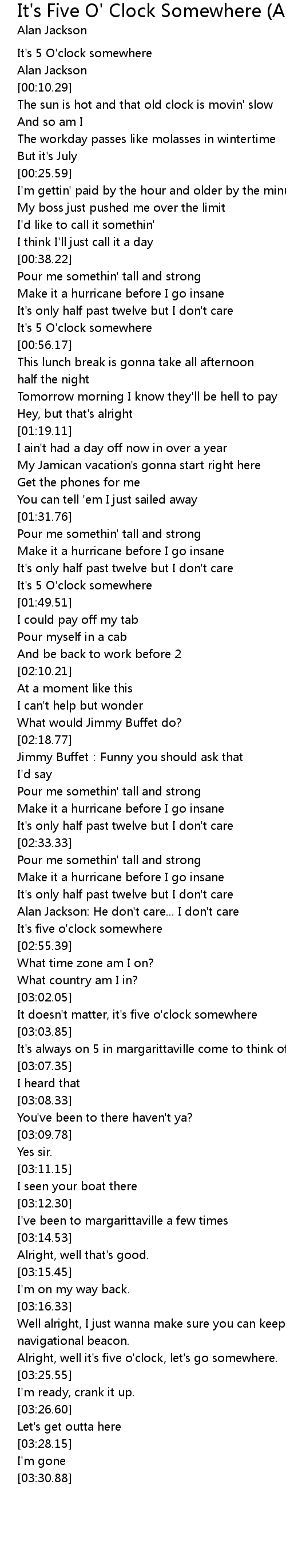 | [03:04.28] | It' s always on 5 in margarittaville come to think of it |