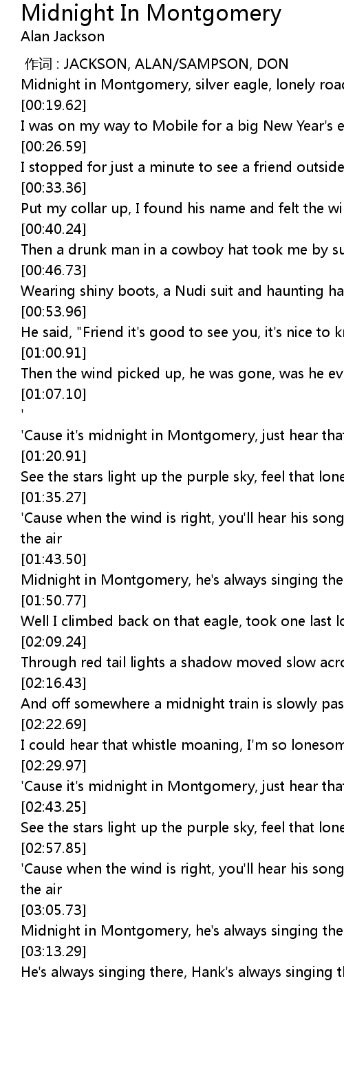 | [01:10.96] | ' Cause it' s midnight in Montgomery, just hear that whippoorwill |