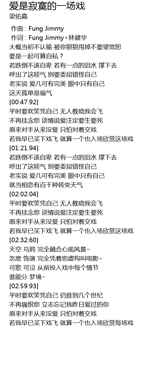 | [00:01.00] | 作词 : Fung Jimmy+林健华 |