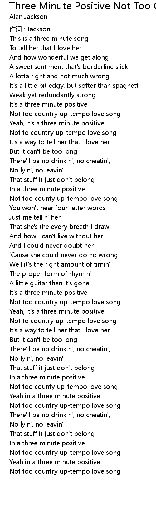 | Song | Three Minute Positive Not Too Country Up-Tempo Love Song |