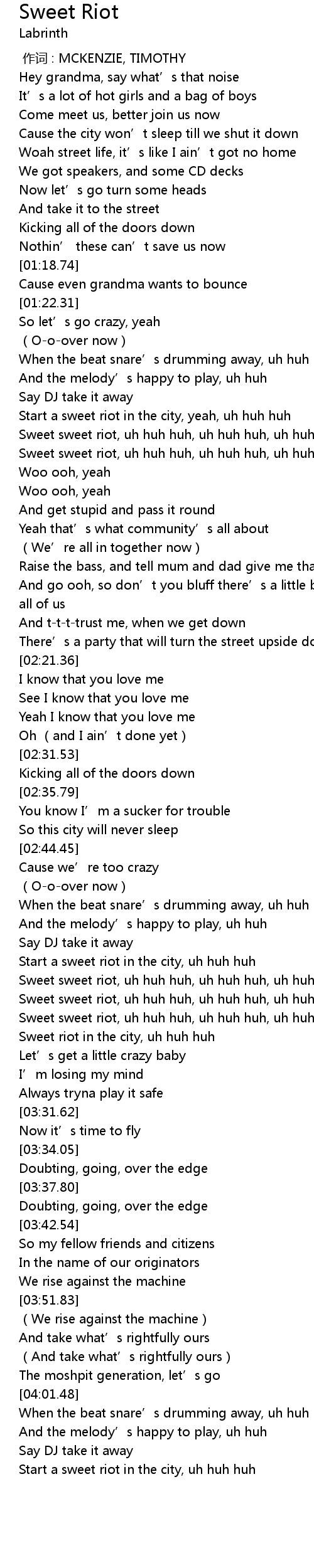 | [03:15.28] | Sweet sweet riot, uh huh huh, uh huh huh, uh huh huh |