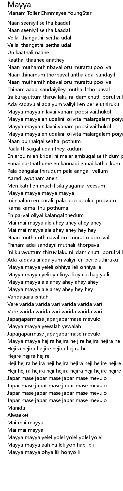 | [01:45.92] | Mayya mayya en udalinil olivita malargalem poiya poiya |