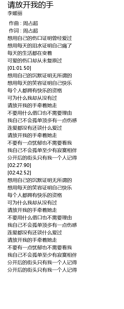 | [01:32.27] | qǐng fàng kāi wǒ de shǒu qiān zhe tā zǒu |