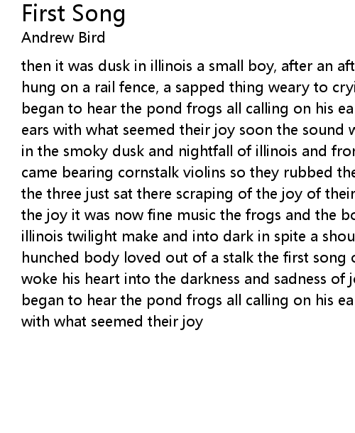| then it was dusk in illinois a small boy, after an afternoon of carting dung hung on a rail fence, a sapped thing weary to crying dark was growing tall he began to hear the pond frogs all calling on his ear they were calling on his ears with what seemed their joy soon the sound was pleasant for a boy listening in the smoky dusk and nightfall of illinois and from the fields two small boys came bearing cornstalk violins so they rubbed the cornstalk bows with resins and the three just sat there scraping of the joy of their joy, they' re scraping of the joy it was now fine music the frogs and the boys did in the towering illinois twilight make and into dark in spite a shoulder' s ache a boy' s hunched body loved out of a stalk the first song of his happiness and the song woke his heart into the darkness and sadness of joy dark was growing tall he began to hear the pond frogs all calling on his ear they were calling on his ear with what seemed their joy |
