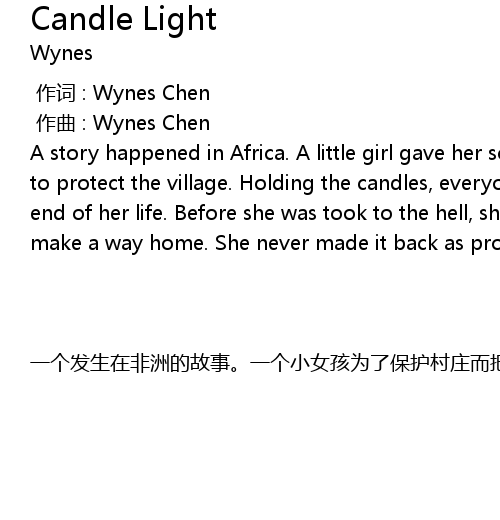 | [00:00.001] | A story happened in Africa. A little girl gave her soul to the Satan to protect the village. Holding the candles, everyone was there for her till the end of her life. Before she was took to the hell, she promised that she would make a way home. She never made it back as promised. |