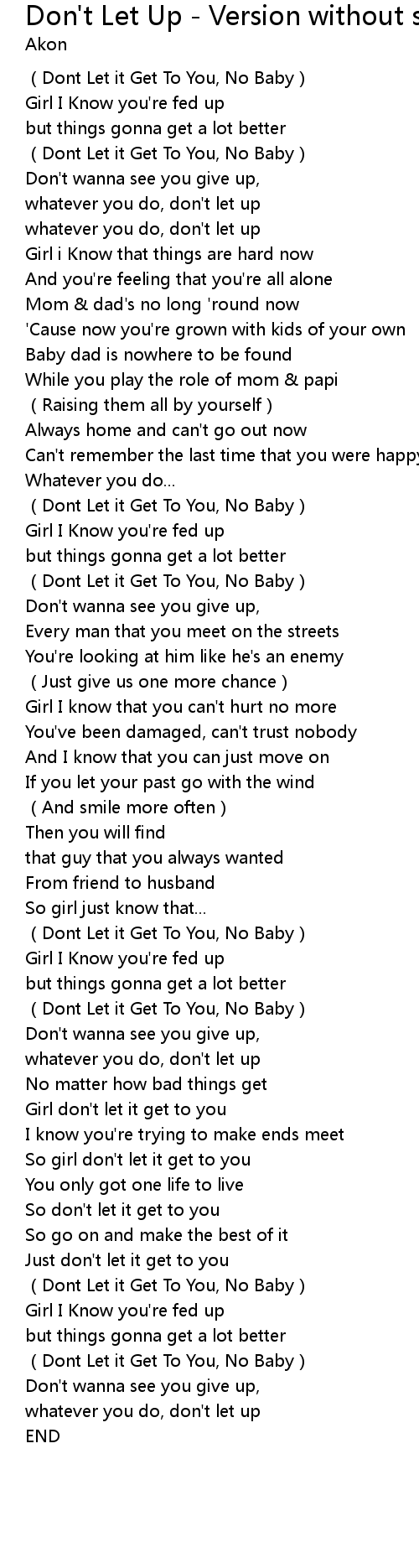 | [00:18.58] | Dont Let it Get To You, No Baby |