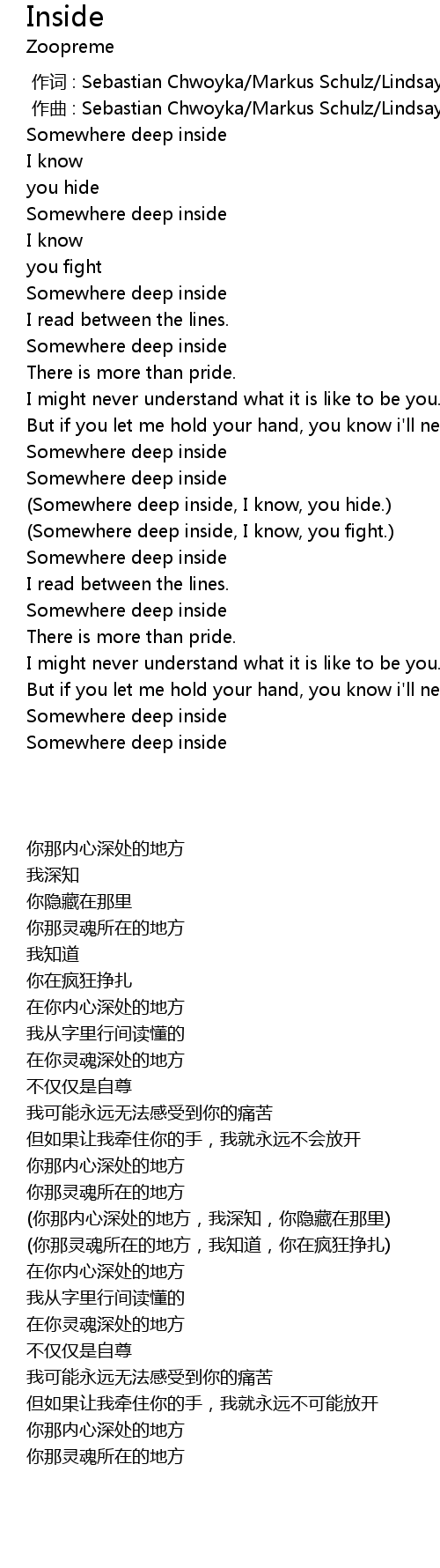 | [01:15.79] | (Somewhere deep inside, I know, you hide.) |