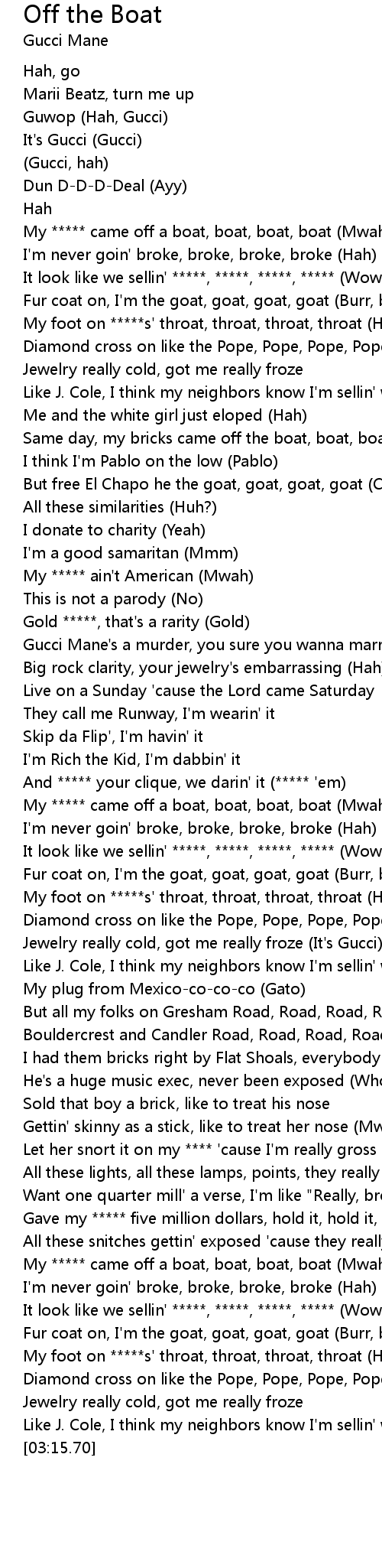 My ***** came off a boat, boat, boat, boat (Mwah) |