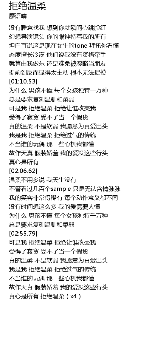 | [01:20.92] | zǒng shì yāo qiú fù kè wēn xún hé róu ruò |