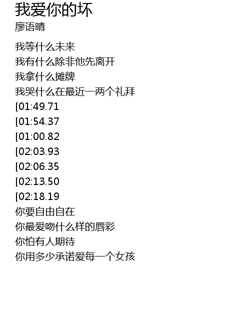 | [00:55.90][02:06.35][02:27.85] | 随时bye就bye 想赖就赖 我还敢爱 |