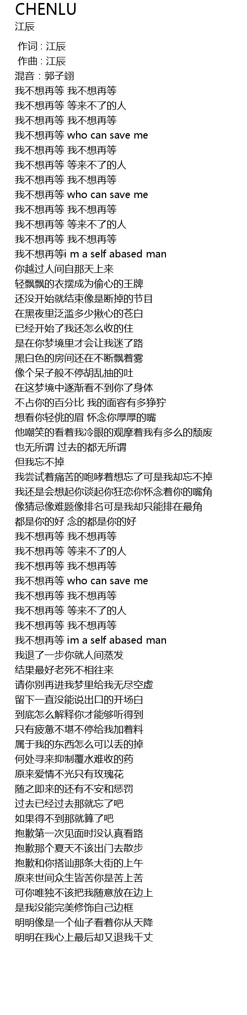 | [00:16.90] | wǒ bù xiǎng zài děng who can save me |