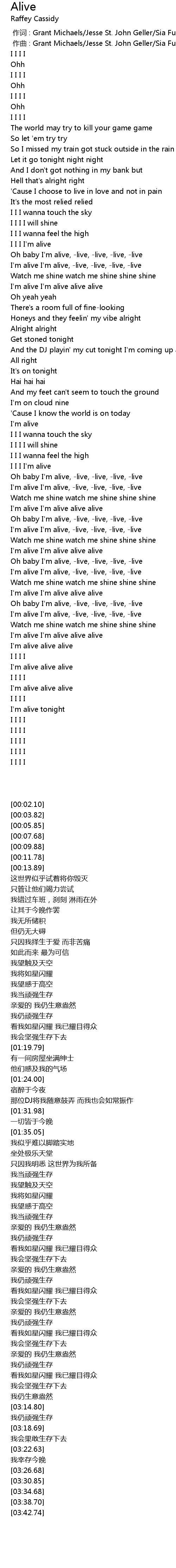 | [01:14.71] | I' m alive I' m alive alive alive |