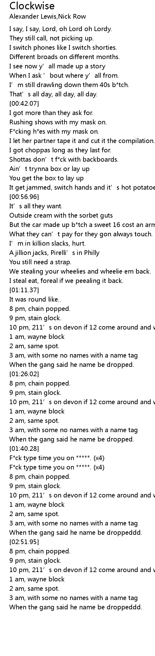 | [02:23.54] | F*ck type time you on *****. (x4) |