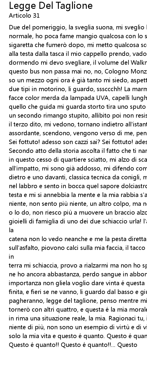 | pagheranno, legge del taglione, penso mentre mi rialzo, loro erano in due | |