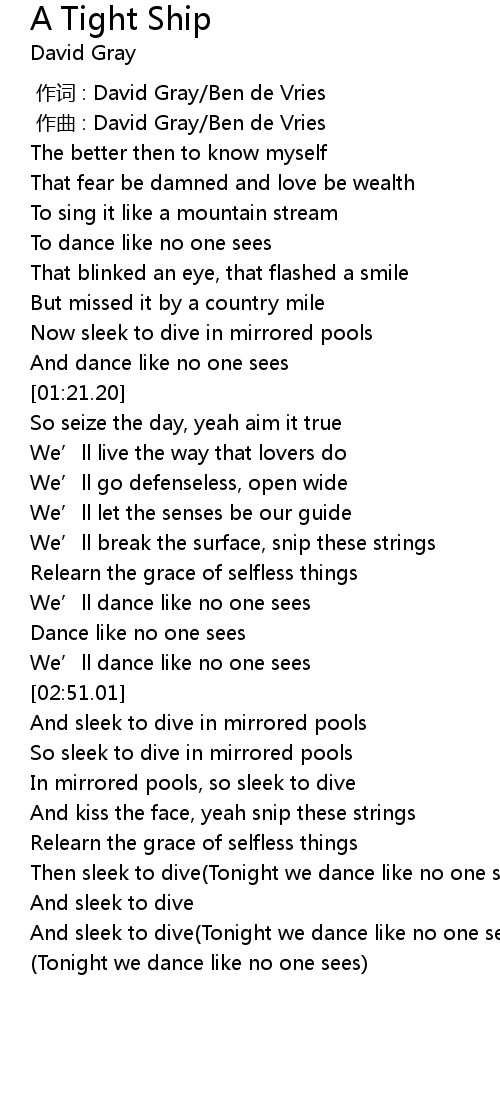| [04:19.12] | Then sleek to dive Tonight we dance like no one sees us |