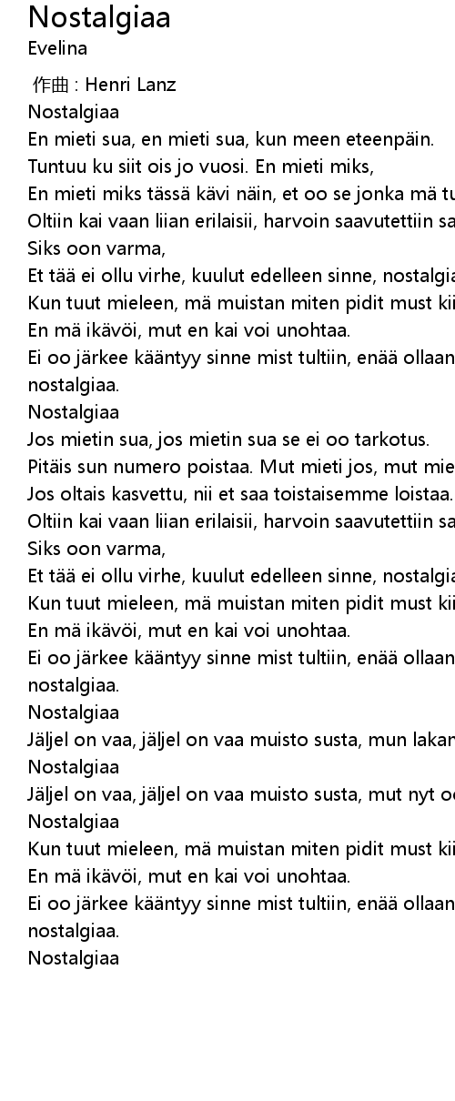 | [02:54.69] | Ei oo j rkee k ntyy sinne mist tultiin, en ollaan vaan nostalgiaa. |