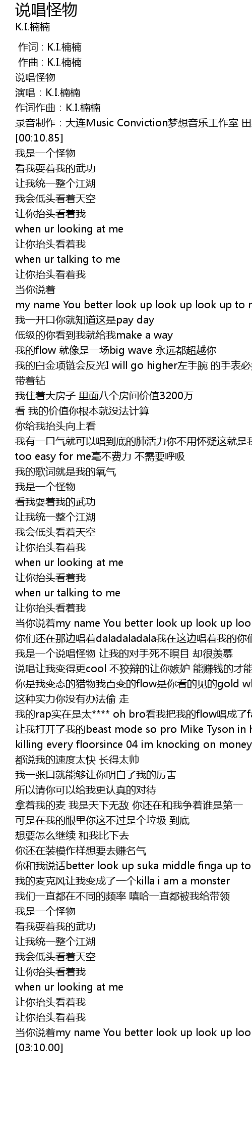 | [01:56.41] | 我是一个说唱怪物 让我的对手死不瞑目 却很羡慕 |