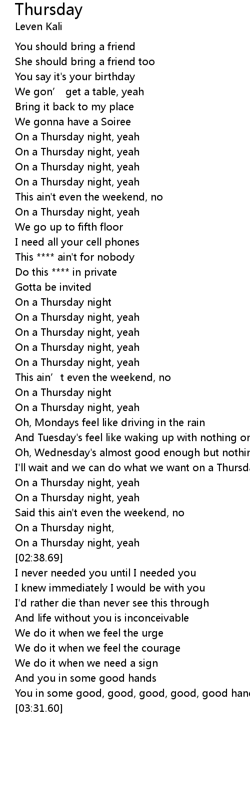 | [02:09.42] | I' ll wait and we can do what we want on a Thursday night, yeah |
