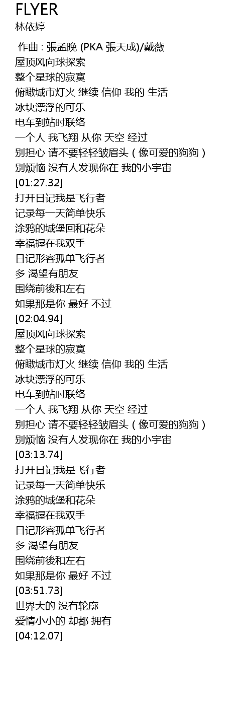 | [03:32.74] | 日记形容孤单飞行者 |