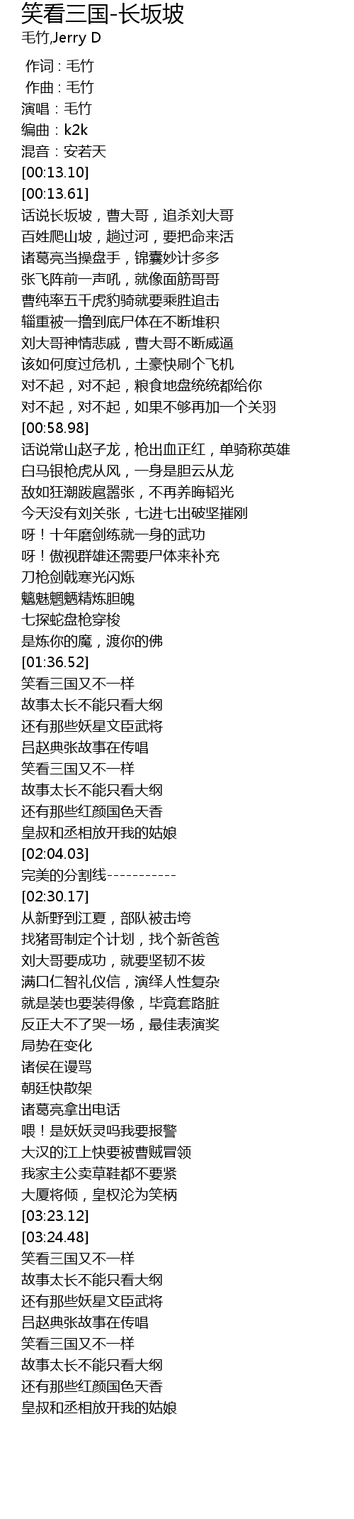 | [00:14.40] | 话说长坂坡,曹大哥,追杀刘大哥 |