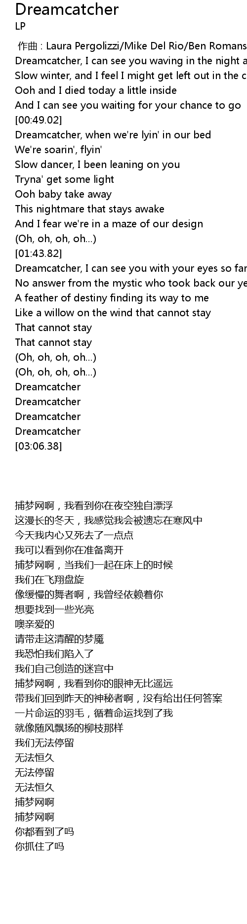 | [00:19.49] | Dreamcatcher, I can see you waving in the night alone |
