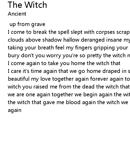 I care it's time again that we go home draped in sheets of blood so beautiful so beautiful my love together again forever again together again forever again the witch you raised me from the dead the witch that gave me blood again the witch we are one again together we begin again the witch you raised me from the dead the witch that gave me blood again the witch we are one again the witch again we again