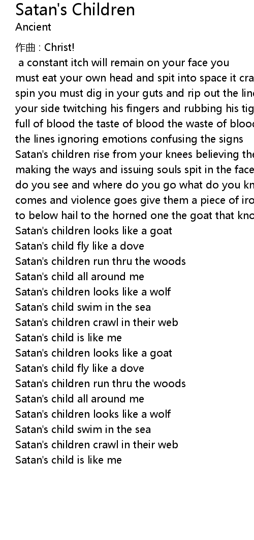 | Satan' s children rise from your knees believing the lies are hard to conceive making the ways and issuing souls spit in the face of those who have tolls what do you see and where do you go what do you know and what can you show vengeance comes and violence goes give them a piece of iron man woes hail to the fury hail to below hail to the horned one the goat that knows | |