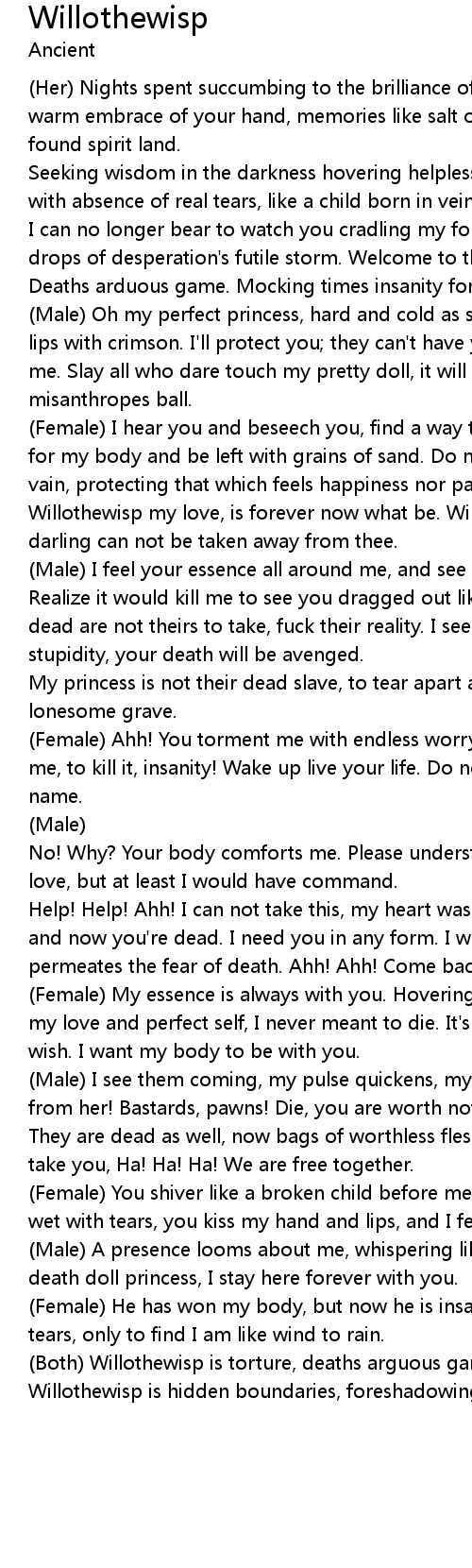 | Willothewisp my love, is forever now what be. Willothewisp my darkened | |