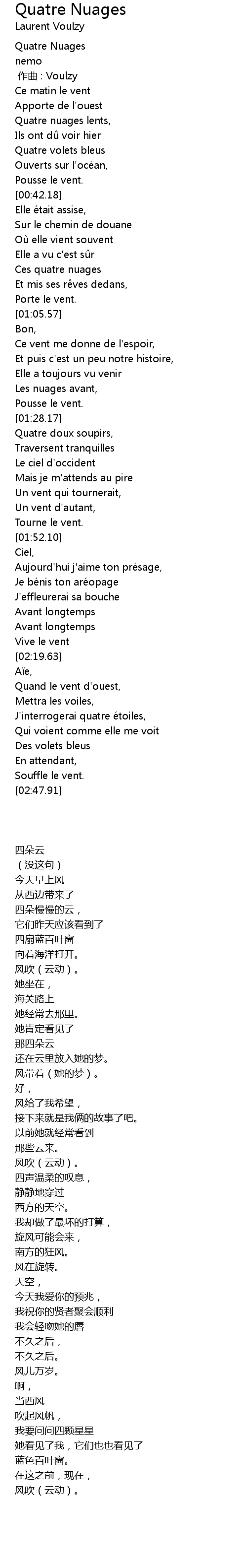 | [01:56.73] | Aujourd'hui j'aime ton présage, |
