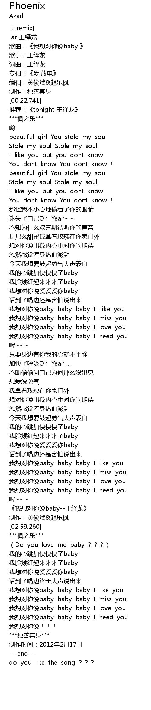 | [02:47.10] | 《我想对你说baby--王绎龙》 |