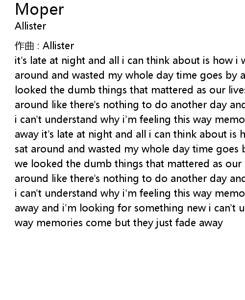 | it' s late at night and all i can think about is how i went to work and just sat around and wasted my whole day time goes by and soon we forget about the way we looked the dumb things that mattered as our lives just slipped away i mope around like there' s nothing to do another day and i' m looking for something new i can' t understand why i' m feeling this way memories come but they just fade away it' s late at night and all i can think about is how i went to work and just sat around and wasted my whole day time goes by and soon we forget about the way we looked the dumb things that mattered as our lives just slipped away i mope around like there' s nothing to do another day and i' m looking for something new i can' t understand why i' m feeling this way memories come but they just fade away and i' m looking for something new i can' t understand why i' m feeling this way memories come but they just fade away |