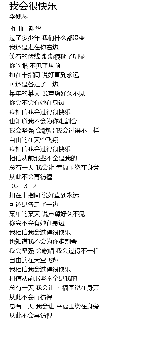 | [03:30.96] | wǒ xiāng xìn wǒ huì guò de hěn kuài lè |