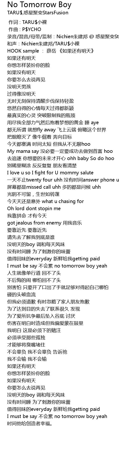 | [03:09.451] | I must be say bú huì lèi no tomorrow boy yeah |