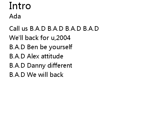 | [00:29.60] | Call us B.A.D B.A.D B.A.D B.A.D |