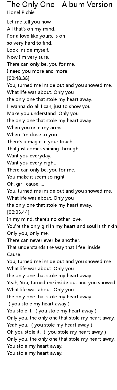 | [03:44.13] | Only you, the only one that stole my heart away. |