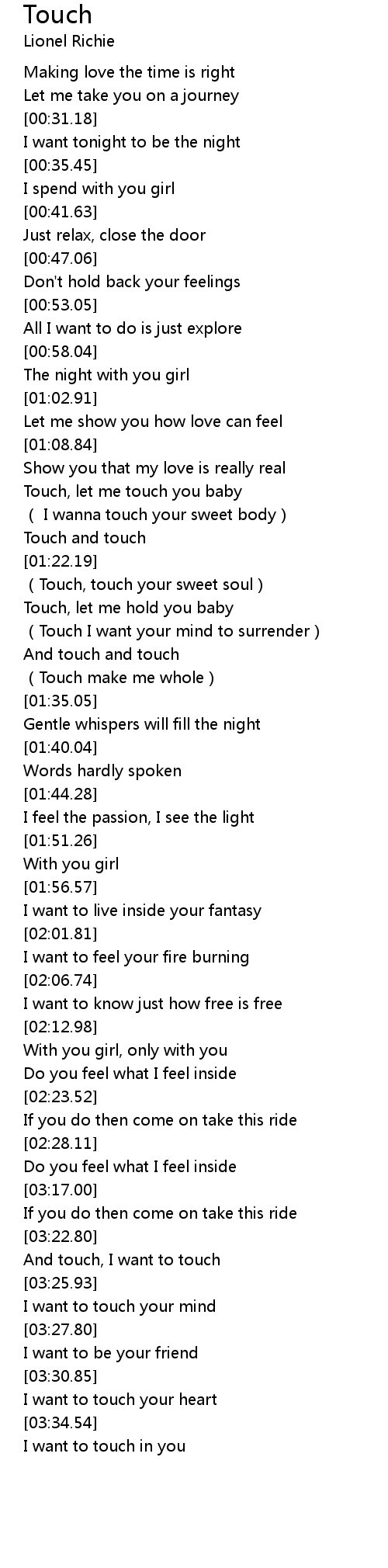 | [01:22.94] | (Touch, touch your sweet soul) |