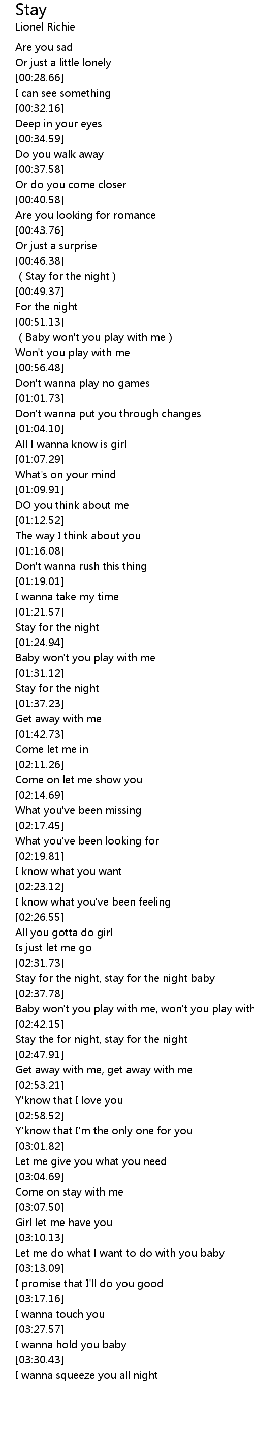 | [02:34.54] | Stay for the night, stay for the night baby |