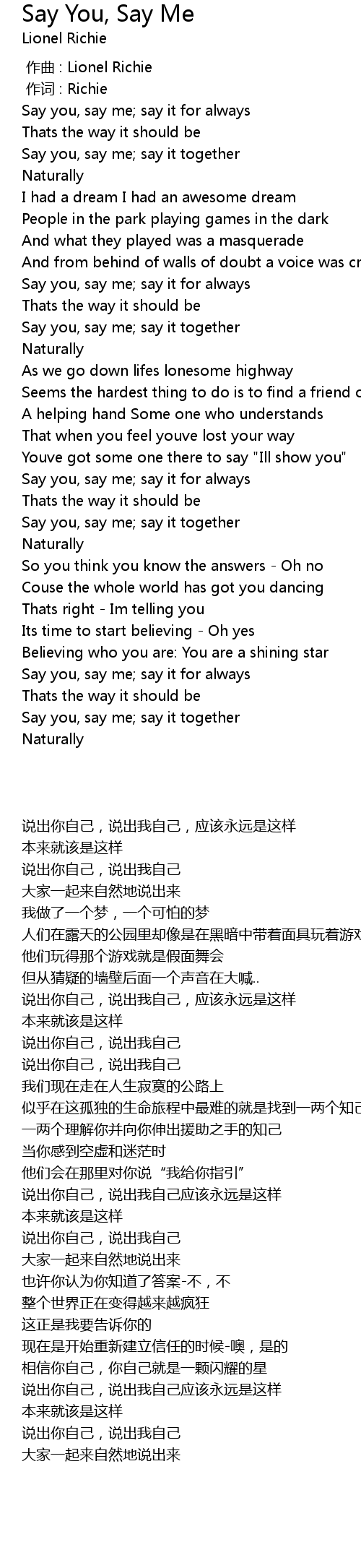 | [00:29.62] | Say you, say me; say it together |