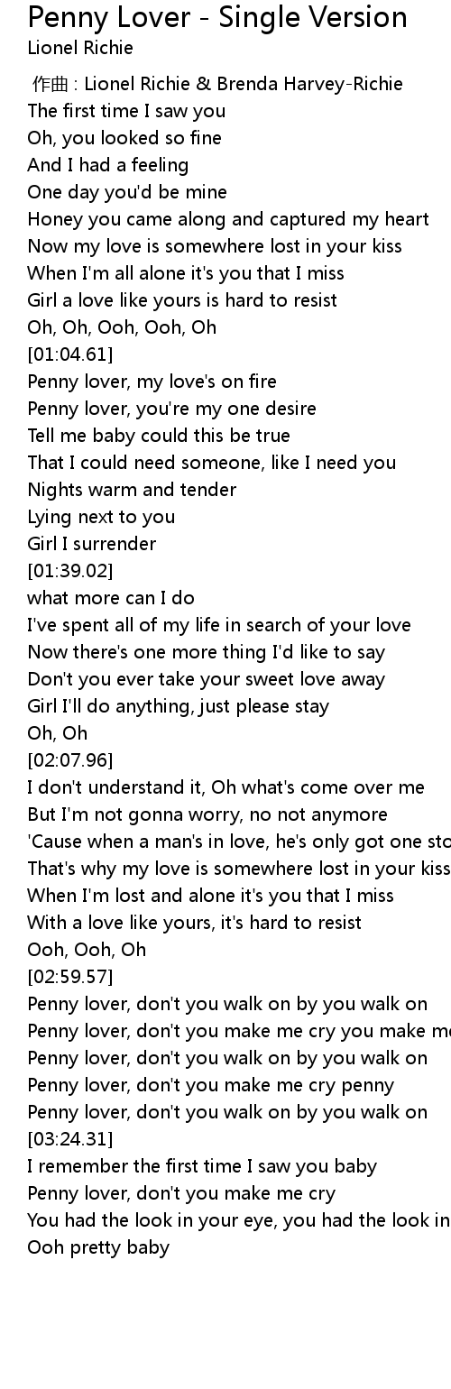 | [03:19.94] | Penny lover, don't you walk on by you walk on |