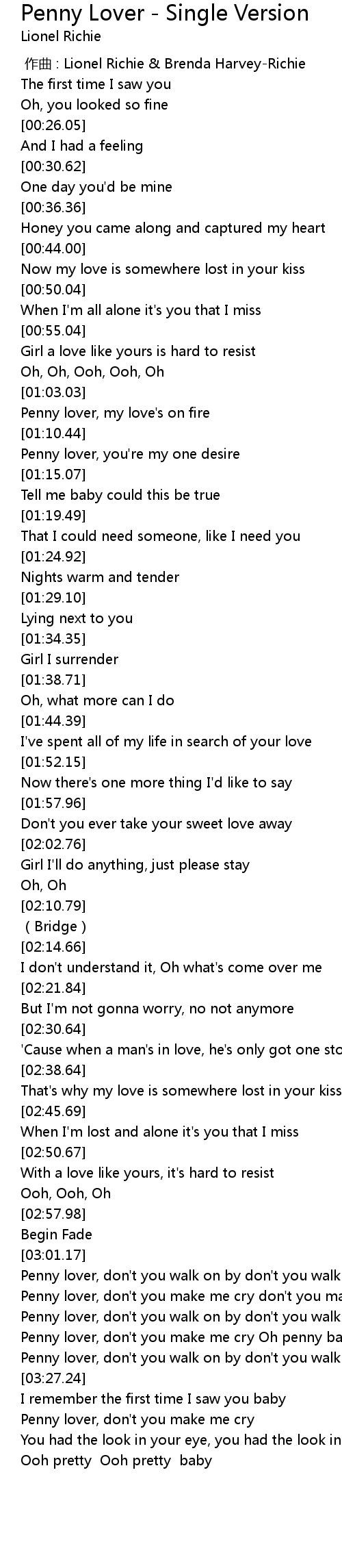 | [03:20.88] | Penny lover, don't you walk on by don't you walk on by |