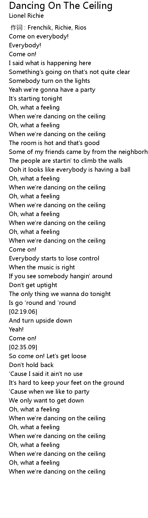 | [03:18.59] | When we're dancing on the ceiling |