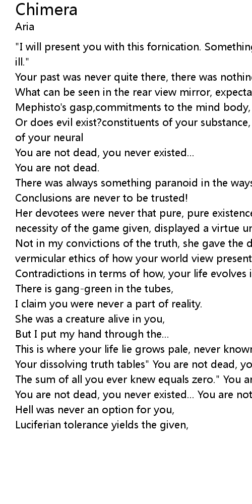 | The sum of all you ever knew equals zero." You are not dead, you neverexisted. You are not dead, you never existed... You are not dead, you never existed." | |